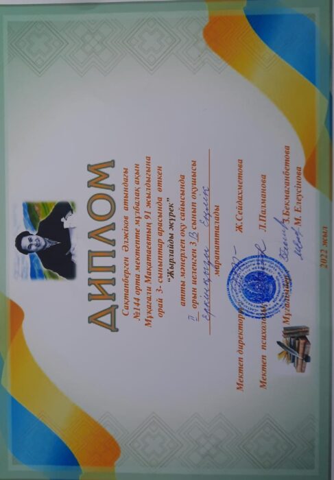 «Жырлайды жүрек» 10 шы ақпан күні 3-сыныптар арасында Мұқағали Мақатаевтың 91 жылдығына орай «Жырлайды жүрек» атты мәнерлеп оқу сайысы өтті.
