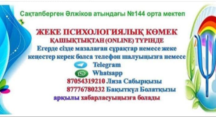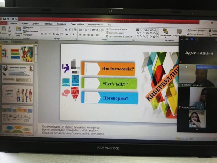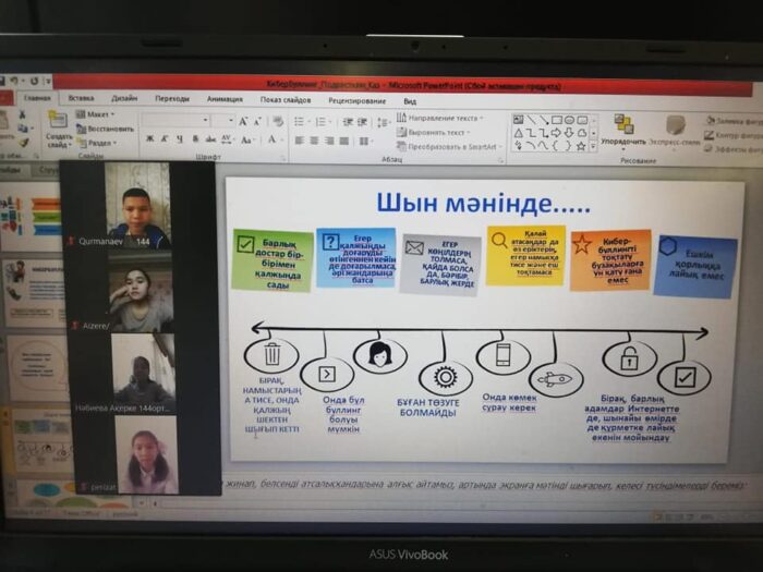 Сақтапберген Әлжіков атындағы №144 орта мектебінде ZOOM платформасы арқылы мектеп психологтары Л.Палманова және Б.Сейтханова мектеп оқушылары арасында «Кибербуллинг немесе телефонға тәуелділік» тақырыбында түсіндірме жұмыстарын жүргізді. Қашықтықтан оқыту кезінде оқушылардың барлығы дерлік әлеуметтік желілерді қолданады. Оңы мен солын танып үлгермеген балалар мен жасөспірімдер үшін ата-аналардың қадағалауынсыз интернет, әлеуметтік желілерді қолданудың өзіндік қауіптілігі бар. Солардың бірі — кибербуллинг. Кибербуллинг – адамды интернетте, әлеуметтік желі мен түрлі мессенджерлерде қорқытып, зорлық көрсету. Кибербуллингке кез-келген адам тап болуы мүмкін. Кибербуллингтен сақтану, психологиялық көмек беру мақсатында өткізілген кездесуде «Ана мен бала карантинде қандай психологиялық проблемаларға ұшырауы мүмкін?», «Бала онлайн сабақ кезінде кибершабуылға тап болмай ма?», » Мұндай жағдайдан сақтану үшін не істейміз? » деген сұрақтар төңірегінде түсіндірме жұмыстары жүргізілді. Кибершабуылға кез болған жағдайдағы сақтану жолдарына тоқталды.